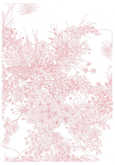 In una serie di disegni recenti a tempera rossa (Vasi e Fiori, 2024) la rappresentazione dei fiori e degli elementi vegetali è un pretesto per lavorare nello spazio del foglio come fosse un vaso bidimensionale, contenitore limitante della vita stessa del disegno. È un’esperienza di messa in crisi del disegno “libero” e della forma rispetto ai confini del supporto.