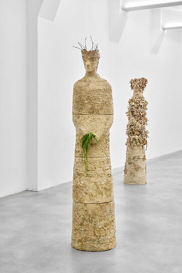Chiara Camoni, Colonna, 2024, gres smaltato con cenere vegetale e minerali vari, legno, gramigna cm 215 x 45 x 45 Courtesy l'artista e SpazioA, Pistoia. Foto di Camilla Maria Santini