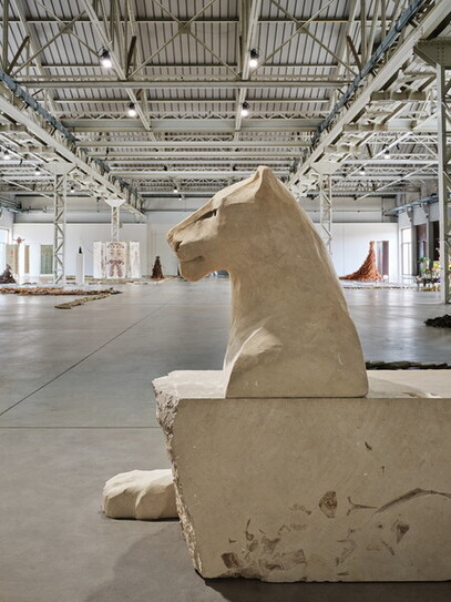 Chiara Camoni, Leonesse, 2024 pietra leccese, inserti di vetro e pietra labradorite dettaglio veduta della mostra a Pirelli HangarBicocca, Milano Courtesy l'artista e SpazioA, Pistoia Foto di Agostino Osio