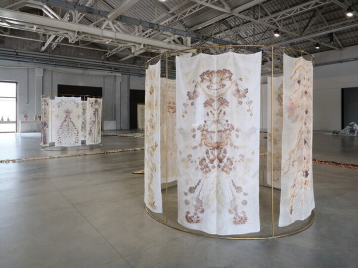 Chiara Camoni, Senza Titolo (una Tenda) #03, 2023 ottone, stampa vegetale su seta cm 205 x 200 Ø veduta della mostra a Pirelli HangarBicocca, Milano Courtesy l'artista e SpazioA, Pistoia Foto di Agostino Osio