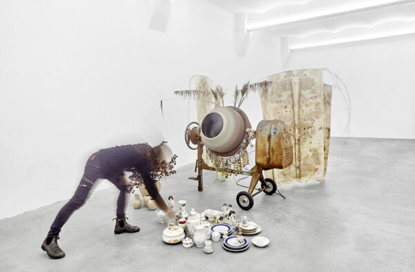 Chiara Camoni, Sfinge, 2022 betoniera, gres smaltato con cenere vegetale, pianta, terra, ceramica e porcellana terzo fuoco, elementi vegetali, ottone, rame, nichel, argento, stampa vegetale su seta cm 190 x 330 x 300 (dimensioni variabili) Courtesy l'artista e SpazioA, Pistoia Foto di Camilla Maria Santini