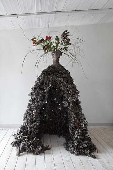 Chiara Camoni, Sister (Capanna), 2022 terracotta nera, ferro, fiori freschi e secchi cm 220 x 140 x 150 (dimensioni variabili) Collezione Nicoletta Fiorucci Foto di Camilla Maria Santini