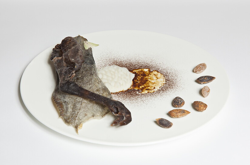 Lucia Leuci, Notturno con eclissi, 2017, porcellana, resina epossidica, pigmenti, trippa, pelle di rombo, polvere di liquirizia, falena, Ø 33 x 5 cm, Fondazione Adolfo Pini, Milano, foto di Laura Fantacuzzi