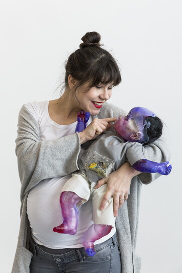 Lucia Leuci, Sculpture 1 (belly), 2017, resina epossidica, tessuto, capelli sintetici, imbottitura, filato, madreperla, plastica, carta, fiori secchi, piselli secchi, piume, 64x50x16 cm, holder: Tereza Štětinová, performance presso Polansky gallery, Praga, foto di Jan Kolský