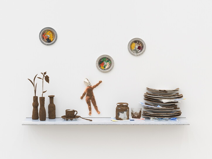 Lucia Leuci, Paesaggio contemporaneo con figura che indica il sole (lavello), 2020, ferro, marmo, terra, acciaio, resina epossidica, pigmenti, ceramica, vetro, vino, argento, plastica, acquerello su carta, 59x100x14 cm, foto di Alessandro Zambianchi