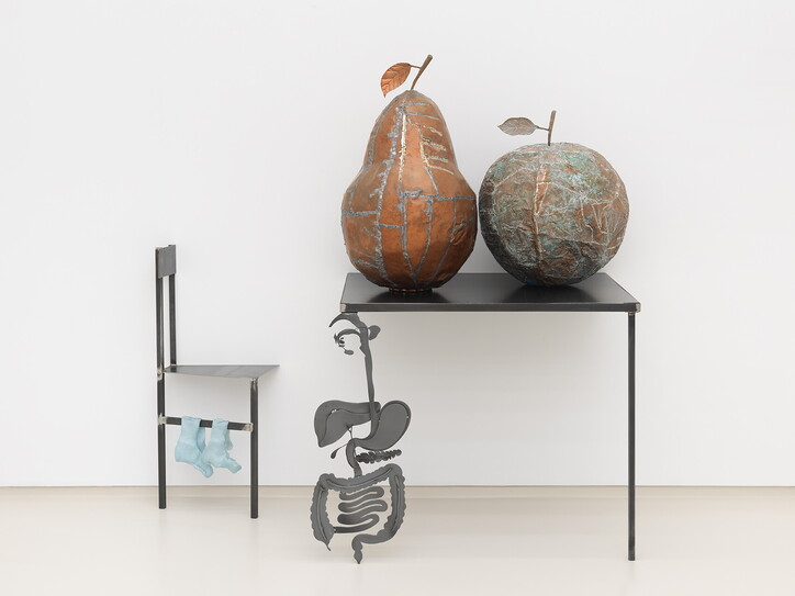 Lucia Leuci, solo show “La ragazza di città" in dialogo con Carol Rama, installation view, Tempesta gallery, Milano. Tavolo della digestione, 2020, ferro, 81x99x70 cm + La butteratura amara della mela, 2020, rame, stagno, verderame, 60x52 Ø cm + Pera da ramo potato in sintonia con i cicli cosmici, 2020, rame, stagno, verderame, 73x52 Ø cm + Ritorno a casa, 2020, ferro, seta, 91x37x25 cm, foto di Alessandro Zambianchi