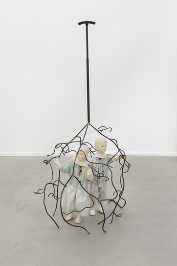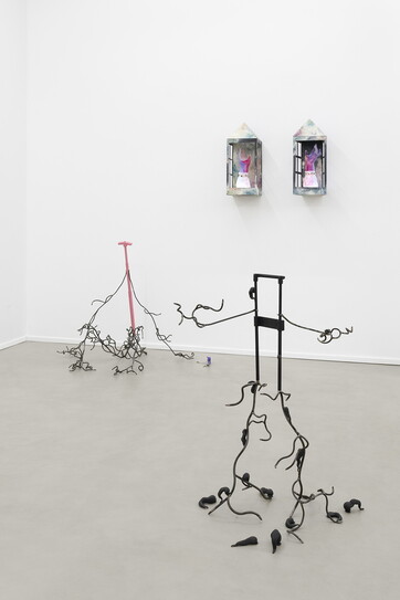 Lucia Leuci, duo-show “Anonymous Encounters” con Dorota Gawęda & Eglė Kulbokaitė, installastion view, eastcontemporary, Milano. Punkabbestia, 2022, ferro, resina epossidica, pigmenti, argento, quarzi, dimensioni variabili + Germinali Post-Liberty, 2022 (dittico), ferro, resina epossidica, pigmenti, tessuto, polvere di alabastro, ombretto, fard, madreperla, conchiglia, fossile, vetro, illuminazione led, 23x55x20 cm - 23x55x20 cm + Antigrazioso (Il figlio), 2022, ferro, plastica, bronzo, colori acrilici, 89x57x70 cm, foto di Tiziano Ercoli