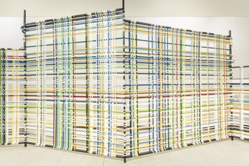 Claudia Losi, Oltre il giardino, 2022; jacquard cotton fabric, iron structure, rope; textile size: 1895 x 146 cm. Realizzato grazie al supporto di Italian Council (IX edizione, 2020). Installation view a Lottozero, Prato. Ph. Toast_Studio / Lottozero, 2024.