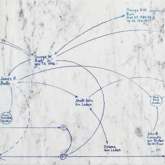 Un artista che sintetizza tutto questo è Mark Lombardi: l’ho scoperto a Kassel nel 2012, quando ero studente dell’accademia in cui ora insegno. Ricerca e analisi rigorosa, formalizzazione impeccabile, biografia a modo suo peregrina: Mark aveva tutte le carte in regola per diventare un’ossessione, e così è stato.