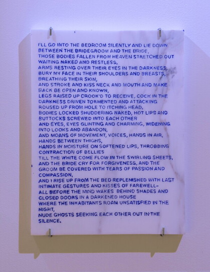 Stefano Serretta, fr. #012 - [A. Ginsberg, Love poem on theme by Whitman], 2024, incisione su marmo di Calacatta, 30 x40 cm