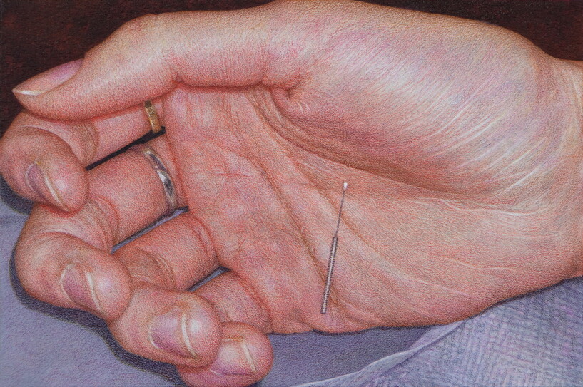 Chiara Enzo, Mano, 2025. Acquerello, pastello, matite colorate su carta applicata su tavola,