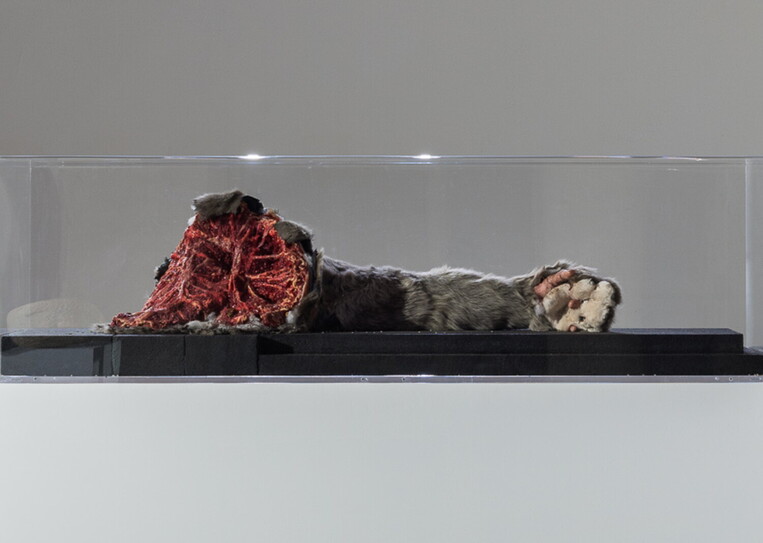 BR’ER RABBIT – Attributed to Paul Thek (1998?), 2023, silicone, pelliccia, insetti, sabbia, 45 x 45 x 155 cm.