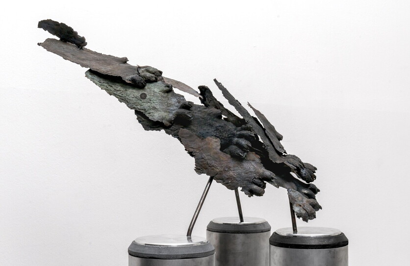 Fade Paw Study (Untitled), 2024, bronzo, alluminio, cemento, 60 × 45 × 172 cm (bronzo), 45 × 40 × 50 cm.