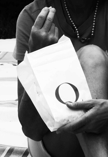 Q, 2025 – stampa su sacchetti di carta e pop corn (particolare dell’installazione)