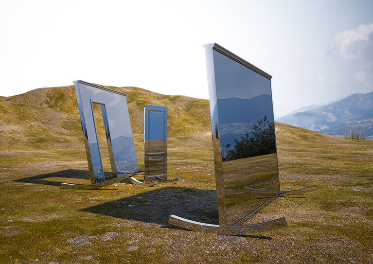 Giuseppe Pietroniro, IN_Stability, 2021, 350 x 250 x 10 cm, acciaio cromato, Courtesy Archivio Pietroniro, ph Fabrizia Basile