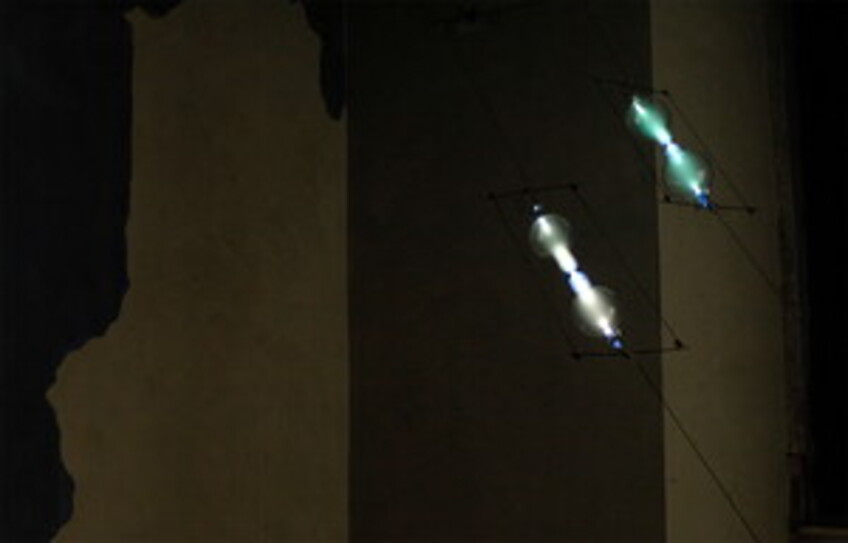 “Orion” 2012, vetro soffiato, gas Argon, cavi d’acciaio, elettricità. Dimensioni variabili.