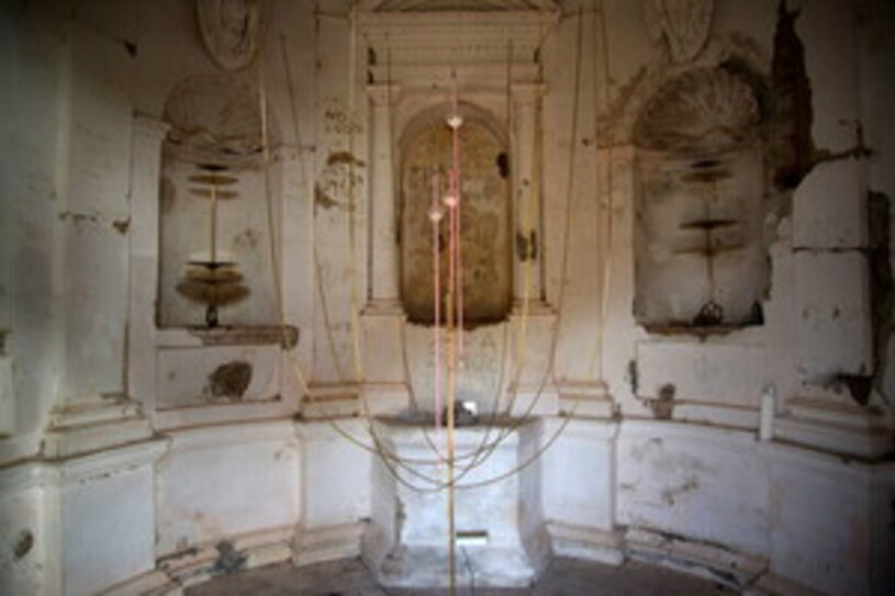 “Sintonie”, titolo dell’intero intervento, è costituito da una struttura in ottone che riprende la pianta ottagonale della cappella. Su di essa poggiano volumi di vetro soffiato, all’interno dei quali scorre una scarica elettrica. All’interno di questi volumi sono stati collocati frammenti di marmo di Carrara che ostacolano il percorso naturale della scarica, costringendola a deviare e generando traiettorie alternative, innescando un processo continuo di aggiustamento e adattamento. Nelle nicchie sono posizionate delle sculture che risuonano con le vibrazioni nascoste del lago, captate da un idrofono posizionato sotto la sua superficie.