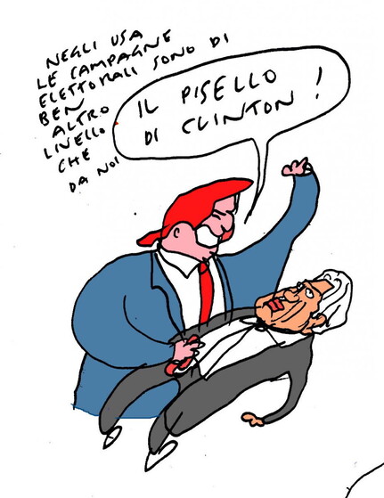 Trump e il pisellino di Clinton. La nota politica di Vincino Giovanni Battistuzzi 24 mag 2016 x 1 di 1 Giovanni Battistuzzi Al Foglio dal 2014. Nato nel giorno più freddo del secolo scorso, lì dove la pianura incontra il Prosecco. Insegue. In libreria trovate Girodiruota e Alfabeto Fausto Coppi. E dal maggio 2023 Lance deve morire, il suo primo romanzo. Su Twitter: @giostuzzi