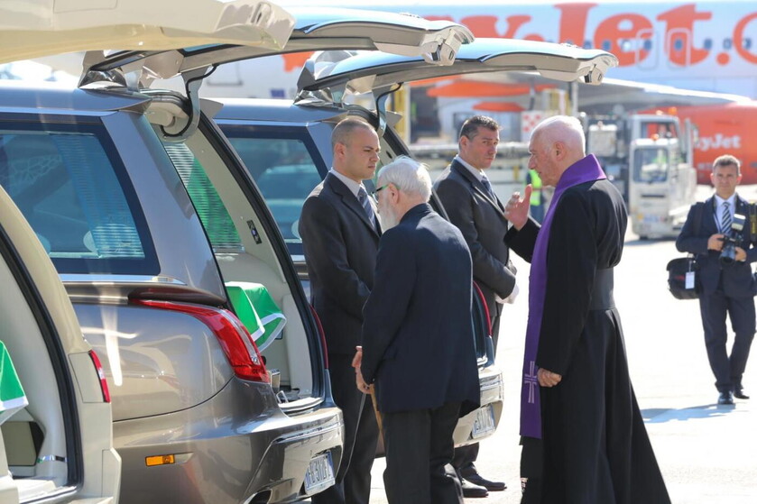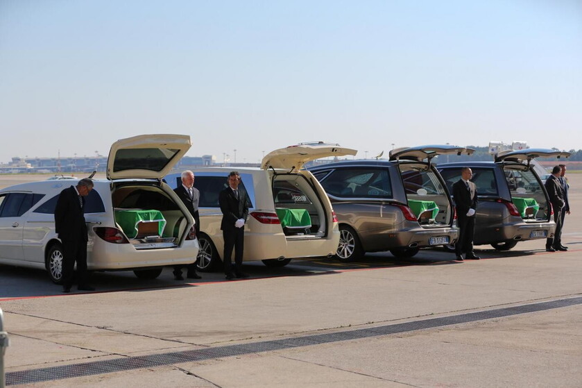 i coniugi vogheresi Angelo D'Agostino e Gianna Muset e i loro amici milanesi Mario Casati e Maria Grazia Ascoli. Mancano invece i corpi di Carla Gaveglio e dell'italo-americano Nicolas Leslie. Erano presenti, oltre ai parenti, anche il presidente della Repubblica Sergio Mattarella, il sottosegretario al ministero degli Affari esteri Vincenzo Amendola, il governatore lombardo Roberto Maroni e il sindaco di Milano Beppe Sala che ha proclamato un giorno di lutto cittadino. Le bare, avvolte nel tricolore, sono state caricate sui carri funebri e benedette dal cappellano dell'aeroporto di Malpena, don Ruggero Camagni.