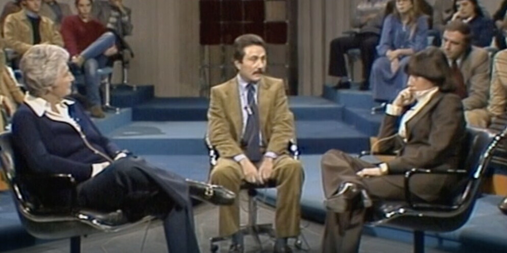Altra puntata cara ai cultori è quella con Paola Borboni contro Manuela Kustermann: due attrici, una vecchissima e gloriosa, e una giovane ed emergente. E lì, siparietto tra la Borboni in delirante mise, tailleur cangiante dorato e occhiali fumé e guantini di tulle, e Arbasino che straparla di “chicche ghiottonerie e giuggiole”. “Ma Arbasino, ma tu non sai niente!”, tuona l’ottuagenaria, con marito quarantenne nel pubblico (lui morirà, poveretto, l’anno dopo, in un incidente a cui lei sopravvive); “sei frastornato! Le tue giuggiole mi hanno fatto già fare indigestione!”. Femminismo (“ho lavorato tutta la vita. Cosa posso essere se non femminista?”) e macho-culture (“il maschio italiano lo vogliono tutte, è un animale importante. All’Italia ha fatto più bene Rodolfo Valentino che Garibaldi”).