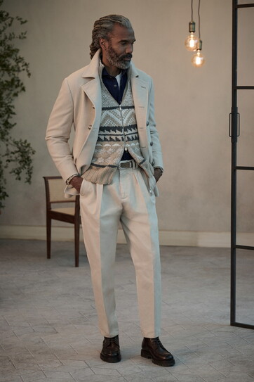 T come texture. Non basta che i tessuti siano tali. Devono essere “materici”, tridimensionali, insomma devono sembrare tessuti veri, come quelli che indossavano i nostri genitori e i nostri nonni, e non i tessili senza corpo, senza struttura, inutilmente ingualcibili dello sportswear e del fast fashion a cui si sono abituate le nuove generazioni. Grande ricerca, e non poteva essere altrimenti, da Etro (speriamo di rivedere quei jacquard nella linea femminile, fra un mese), grandissima da Brunello Cucinelli, con micro effetti speciali come Donegal e chevron.