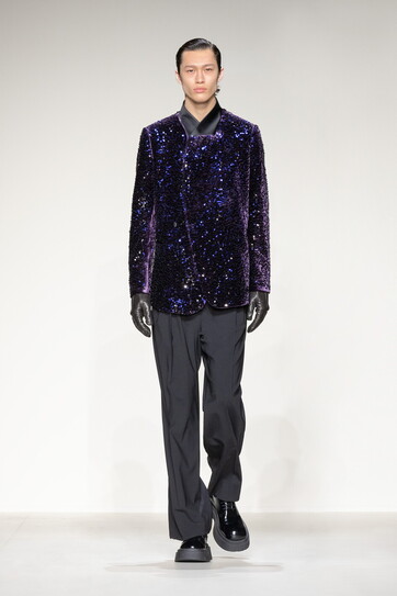 La platea ammutolisce in attesa di confrontarsi sulla presunta ironia di un’affermazione che ribalta il sentiment della moda dell’ultimo decennio, spostando l’accento sulle belle giacche formali (“non mi piace vedere gente che si siede trasandata a tavoli importanti”), le pellicce finte, stampate animalier, molto divertenti, i velluti di quel punto di blu notte che riesce solo a lui, l’abbigliamento da sci, rosso e grigio, che sembra un tuffo nelle tinte degli Anni Ottanta: una collezione pensata per un uomo gentile, nei modi, nelle affermazioni, nella cultura (“io penso alle collezioni guardando fuori dalla finestra del mio studio, qui in via Borgonuovo, frequentando questo quartiere”, dice spiegando le ragioni di una collezione ispirata agli atri e ai bei cortili che si aprono su queste, le vie più belle di Milano.