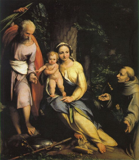 Apprezzata viceversa anche per l’appropriatezza botanica è la palma del vero Raffaello nella “Sacra famiglia con palma” a Edimburgo. Quanto alla tua controversia con Grasso sui frutti, c’è la bella favola dello pseudo Matteo che ispirò Correggio per la pala della Fuga in Egitto con San Francesco, agli Uffizi. Maria chiede a Giuseppe di raccoglierle i frutti. (In altre versioni si tratta di ciliegie, e così nella “Cherry Tree Carol” cantata da Joan Baez e gli altri). Giuseppe non ci arriva, e allora è Gesù a far abbassare i rami della palma e a riceverne i frutti dalla mano di Giuseppe: datteri.