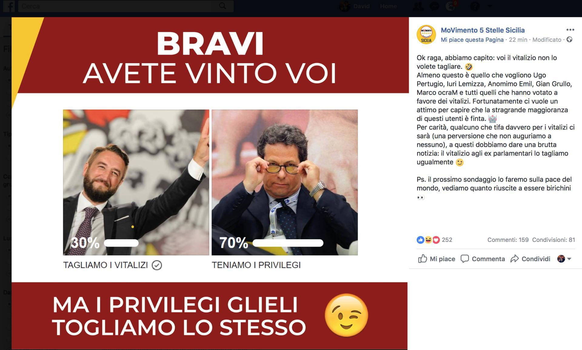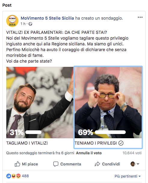 E dunque tocca schierarsi. Da un lato il volto sereno di Giancarlo Cancelleri, due volte candidato governatore in Sicilia per i cinque stelle e due volte sconfitto; dall'altro un minaccioso Gianfranco Micciché (si scrive così), l'attuale presidente dell'Assemblea regionale siciliana e plenipotenziario di Silvio Berlusconi nell'isola, che guarda di sottecchi, con sguardo enigmatico, la camera. Parrebbe insomma scontato l'esito del voto, anche in virtù del fatto che per dare la propria preferenza è necessario entrare sulla pagina ufficiale del M5s Sicilia. E invece no. Alle tre del pomeriggio, quando i voti espressi attraverso un click sono oltre 10.600, chi vuole "tenere i privilegi" è in vantaggio col 69 per cento. Col passare delle ore aumentano i voti, ma le percentuali non cambiano. E alla fine il M5s Sicilia, invece di cancellare il sondaggio, decide di rispondere.