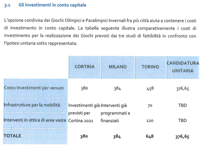 Le cose sono andate diversamente, anche perché la Lega, con il sottosegretario Giancarlo Giorgetti, ha scoperto il bluff e rilanciato. E ora tutto appare a dir poco surreale. Da un lato c'è Appendino che ricorda come la candidatura di “Torino era la meno costosa, la più sostenibile, la candidatura naturale per l’Italia”. Peccato, però, che la sua stessa maggioranza in Sala Rossa, proprio su quella “candidatura naturale”, non era riuscita a trovare un'intesa decente, costringendo la sindaca a trasferire la discussione in Città metropolitana. E peccato soprattutto che, secondo la tabella presente nella proposta ufficiale del Coni datata 1 agosto (foto sotto), il dossier olimpico di Torino era quello che costava di più.