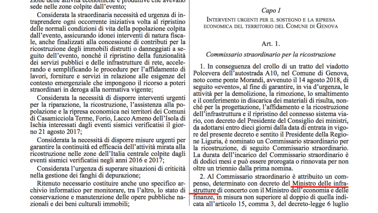 La dicitura esatta e legale del suo incarico è “Ministro delle infrastrutture e dei trasporti”. Peccato che, al comma 2 dell’articolo 1 (foto sotto), uno degli articoli più importanti sulla ricostruzione del ponte Morandi ci sia scritto “Ministro delle infrastrutture”.