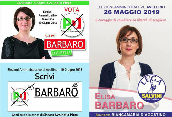 Ad Avellino, ad esempio, c’è chi ha provato a confondere le acque cambiando appena il nome sul proprio santino elettorale. E così a giugno scorso, nelle file del Pd, figurava Elisabetta Barbaro (foto sotto), convinta sostenitrice di Nello Pizza; ora, a raccogliere voti per la neosalviniana Biancamaria D’Agostino in vista delle nuove elezioni resesi necessarie dopo il precoce fallimento della giunta grillina, c’è Elisa Barbaro. Ma è sempre lei, la stessa persona che stavolta, semplicemente, ha optato per il soprannome con cui tutti in città la conoscono.