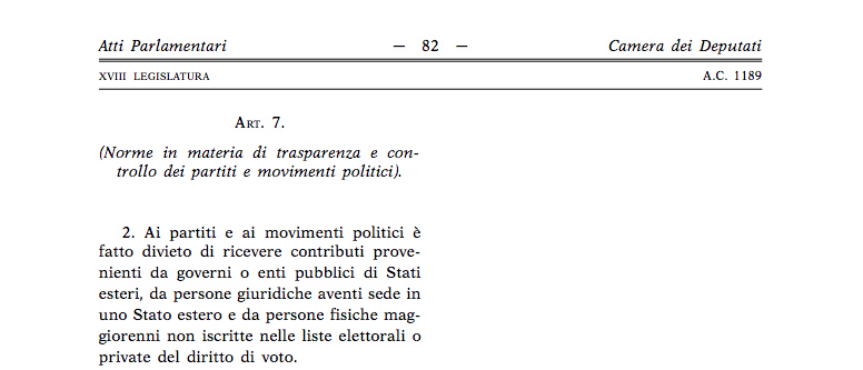 “Ai partiti e ai movimenti politici è fatto divieto di ricevere contributi provenienti da governi o enti pubblici di Stati esteri, da persone giuridiche aventi sede in uno Stato estero e da persone fisiche maggiorenni non iscritte nelle liste elettorali o private del diritto di voto”.
