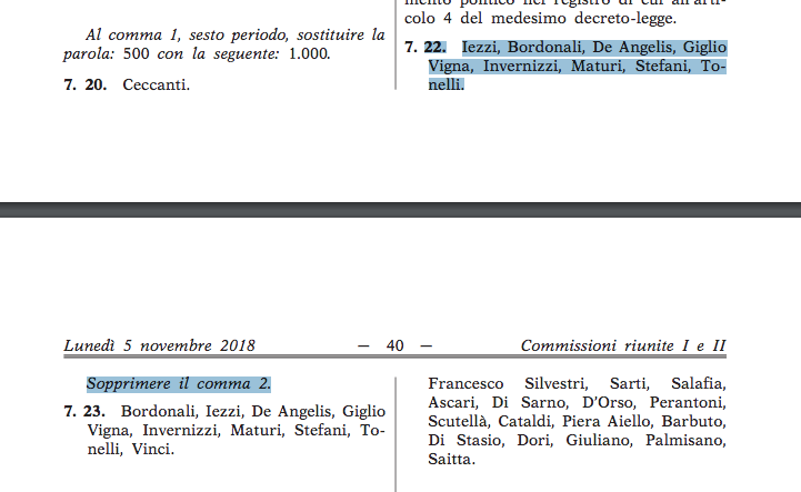 Su questo comma il Carroccio fa ostruzione e il 5 novembre 2018 presenta un emendamento firmato da nove deputati. Vediamolo.