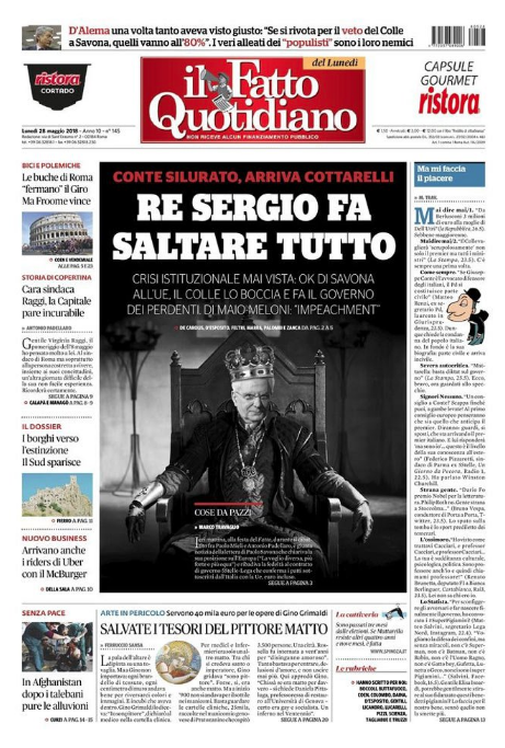 Anche Fratelli d'Italia giudicò la scelta di Mattarella come un tradimento della sovranità nazionale e una capitolazione a Bruxelles. I tweet contro il capo dello stato erano lo specchio di un'opinione pubblica fortemente polarizzata, anche a causa della campagne contro il presidente della Repubblica portate avanti da alcuni giornali come il Fatto quotidiano (in basso la copertina del 28 maggio), Libero e Verità.
