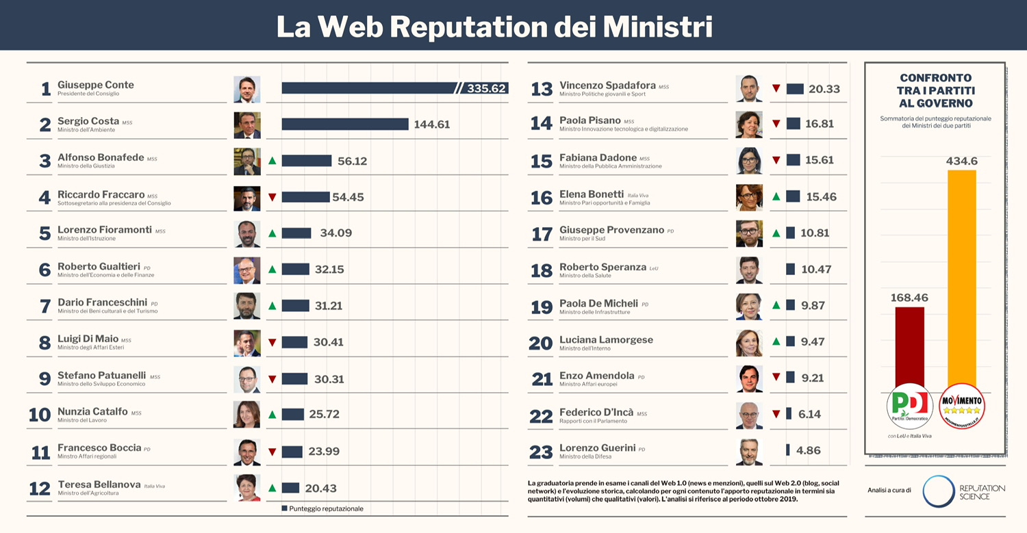I Cinque stelle conquistano tutte le prime posizioni fino al quinto posto. Dopo Bonafede, è il sottosegretario grillino alla presidenza del Consiglio Riccardo Fraccaro a conquistare più consensi. Fraccaro è agile nello sfruttare il potenziale mediatico della sua delega alle politiche del settore spaziale – si congratula, ad esempio, con l’astronauta italiano Parmitano–. Inoltre è lui ad annunciare, con soddisfazione, l'approvazione del ddl per il taglio dei parlamentari alla Camera. Il quinto posto spetta a Lorenzo Fioramonti, 34,09 punti, noto per il suo assenso agli scioperi per il clima e forte di un accordo con le organizzazioni sindacali sui precari della scuola, spiega Reputation Science.