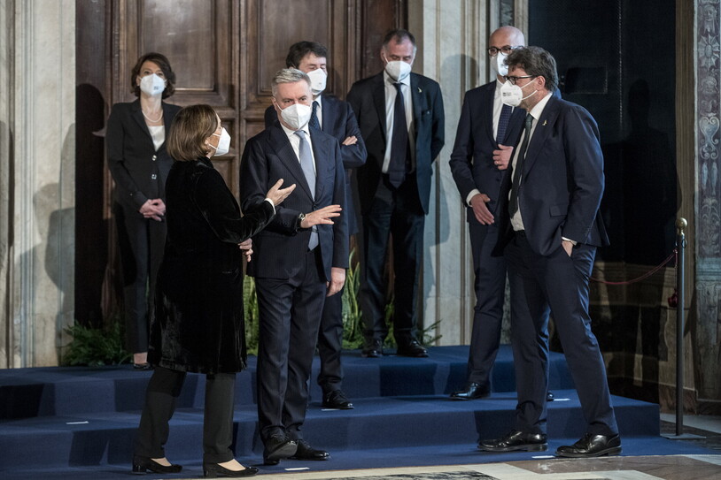Mentana ogni tanto faticava a riconoscerli, commentando la diretta, non solo per colpa della mascherina, ma per via dell’unità di vestizione. Unità, non conformità, né anonimato, né anedonia, né noia, né freddezza. Anche solo da guardare, questo governo che ieri sera sembrava deluderci perché ci aspettavamo l’impeto e l’assalto, ora ci sembra affascinante, promettente, protettivo. E bello, ed elegante, e galante. Ci chiede di non fare pettegolezzi: non ne faremo. Però. Però nel silenzio dell’osservazione una cosa s’è notata, non appena le mascherine sono calate (quanto sono utili le mascherine: prevengono, calmierano, difendono, contengono, recitano splendidamente), non appena i ministri si sono messi in posa per fare la foto e si sono mostrati a misura intera, dal primo giorno di scuola s’è passati al Natale in famiglia e i dissapori, gli scontenti, e la radiografia degli umori è emersa. Hanno sorriso apertamente i leghisti: Giorgetti in posa da podio olimpionico, Stefani rilassatissima, Garavaglia quasi sexy. L’agnizione migliore è stata la loro e sono stati premiati come si premiano i bimbi quando cambiano i denti, perché stanno crescendo, forse migliorando. Il Pd, invece, ha malcelato lo scontento: Guerini torvo, Speranza rigido e rugoso come un calanco, Orlando addirittura mascherinato (l’unico) e con lo sguardo basso. Hanno sorriso i tecnici, Cartabia più di tutti: dovranno spendere, non tagliare. Sanno che sarà più facile amarli.