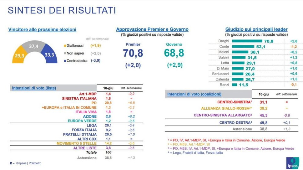 Chi invece va male è Forza Italia, che perde poco più di mezzo punto: ed ora, secondo Ipsos, è al 9,2 per cento. E male va pure il M5s, che perde ancora 6 decimali e scivola al 14,2 per cento, in una settimana in cui del resto si attendeva l'effetto positivo di Giuseppe Conte. Che agisce, semmai, al contrario: visto che, nella classifica dei leader, l'ex premier perde 1,2 punti, restando comunque al 52,1 per cento dei consensi personali. Al contrario, Mario Draghi guadagna due punti e sali al 70,8 per cento di gradimento individuale, col suo governo che acquista nel complesso quasi 3 punti e si assesta al 68,8 per cento di consensi.
