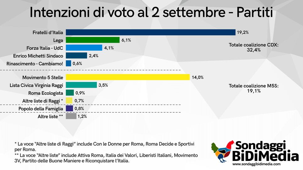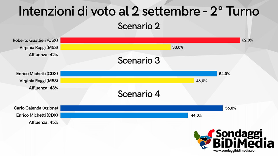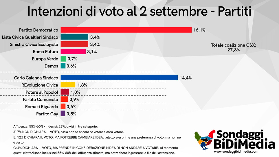Il sostegno di Fratelli d’Italia e Lega, rispettivamente al 19 e 6 per cento, non basterebbe al tribuno di Radio Radio per strappare la carica di sindaco di Roma: nel caso in cui il suo sfidante fosse Roberto Gualtieri, lo scenario più probabile, finirebbe per perdere contro l’ex ministro dell’Economia del governo Conte bis, 45 contro 55. A meno di sorprendenti sviluppi, il favorito resta dunque il candidato del Pd, che il 3 e 4 ottobre dovrebbe arrivare solo secondo con il 27%. Anche se il Pd in città otterrebbe un risultato peggiore di quello del 2016: il 16 per cento.