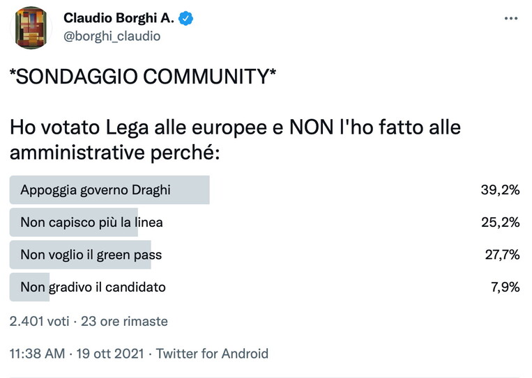 Sul social network, il giorno dopo la disfatta, spunta un sondaggio con quattro opzioni. Alla domanda sul perché non si sia confermato il voto alla Lega alle elezioni amministrative, Borghi predispone queste possibili risposte: “Appoggia governo Draghi”, “Non capisco più la linea”, “Non voglio il green pass” e “Non gradivo il candidato”. Se si esclude l’ultima, però, emergono le reali intenzioni del deputato, neanche troppo tra le righe: criticare la partecipazione del suo partito al governo. E infatti i suoi fan rispondono quasi sempre le prime tre, ignorando l’opzione-esca sul candidato (ferma a meno dell’8 per cento dei voti).