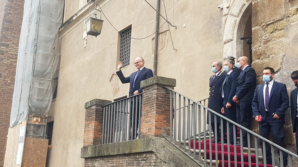 Nessuna bandiera del Pd ad aspettare l'ex ministro dell'Economia. Ad accoglierlo, questo sì, un timido applauso partito da un gruppo di cittadini in piazza del Campidoglio. È lo stile Gualtieri. Sorrisi e portamento istituzionale. È emozionato? I fotografi e gli operatori ci provano. Ma il sindaco - look "Via XX Settembre": in blu ministero - non risponde. Sorride. Saluta con la mano. Passa sotto la lupa capitolina e poi su per gli scalini che portano all'ufficio di Raggi, ormai ex sindaca. Poi entrambi, Gualtieri e Raggi, si affacciano dal balconcino dello studio del sindaco con vista sui Fori Imperiali.
