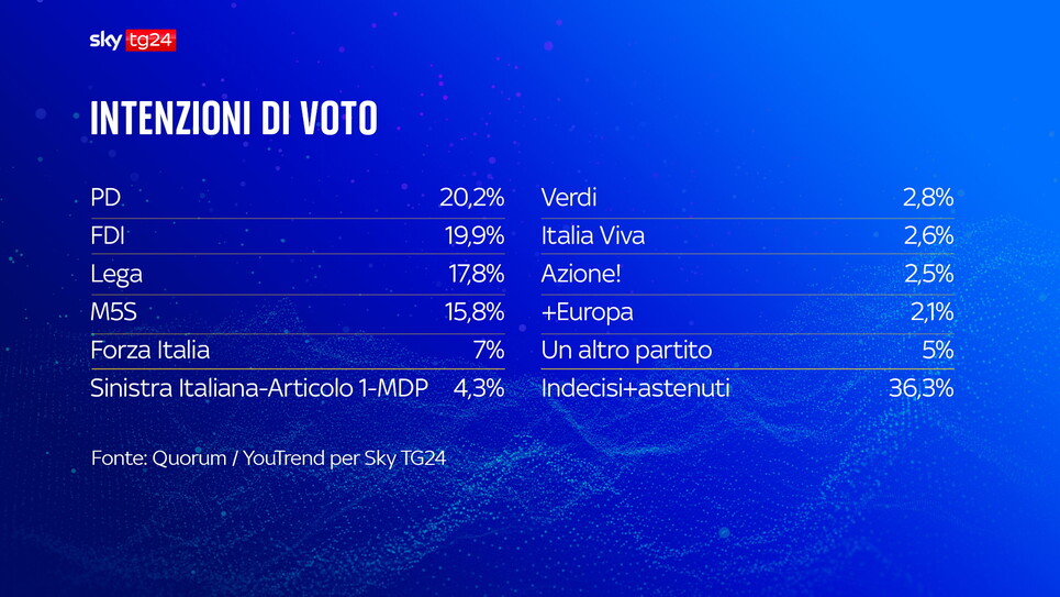 Al centro, balla circa un 10 per cento in cui non c'è una forza politica in grado, almeno secondo questa rilevazione, di emergere sulle altre: nessuna tra Italia Viva, Azione e +Europa supera il tetto del 3 per cento. Il partito di Matteo Renzi è tuttavia tra questi quello messo meglio, arriva al 2.8 per cento. Ma più di un italiano su tre si dichiara indeciso o vorrebbe astenersi, un'ulteriore conferma del clima di incertezza e sfiducia che avvolge la politica, ma segno anche che esiste un ampio spazio di consenso che può essere intercettato da qui alle prossime elezioni.