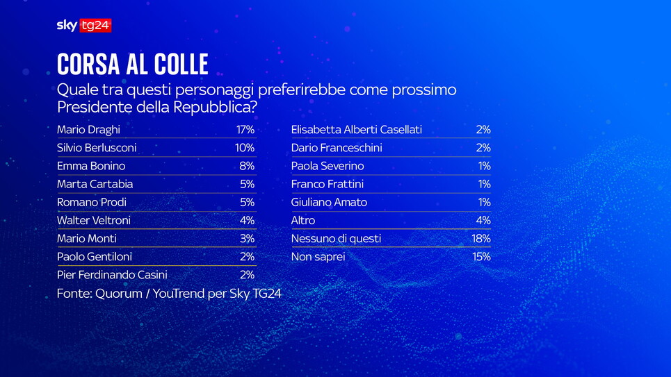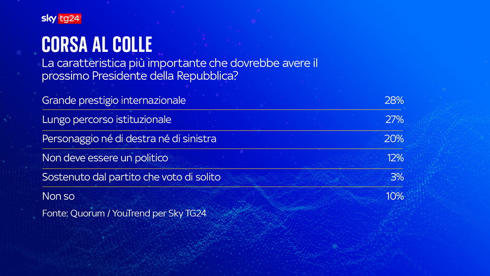 Grande prestigio internazionale, un lungo corso istituzionale e possibilmente non collocato, o percepito, come di destra o di sinistra: sono queste le principali caratteristiche che dovrebbe avere il prossimo inquilino del Quirinale secondo gli italiani. È l'identikit tracciato da un sondaggio di Quorum/YouTrend per SkyTg24, un profilo che, a precisa domanda, corrisponde a quello di Mario Draghi per quasi un cittadino su cinque.