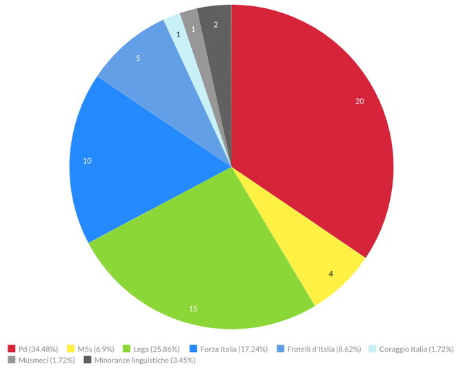 La maggior parte dei 58 grandi elettori delle regioni vanno al centrodestra: 32 su 58. La Lega ne guadagna 15, segue Forza Italia con 10, mentre 5 sono di Fratelli d’italia. Si aggiungono, infine, il governatore siciliano, vicino alla Lega, ma autonomo, Nello Musmeci e quello della Liguria Giovanni Toti, leader di Coraggio Italia. Con 20 delegati, il Pd è il partito che ottiene più grandi elettori da aggiungere alle truppe parlamentari. Sempre nel campo del centrosinistra, si aggiungono i 4 delegati regionali del M5s. Poi, i due delle minoranze linguistiche, il governatore della Valle d’Aosta Erik Lavevaz e il presidente del consiglio regionale trentino Josef Noggler del Südtiroler Volkspartei.