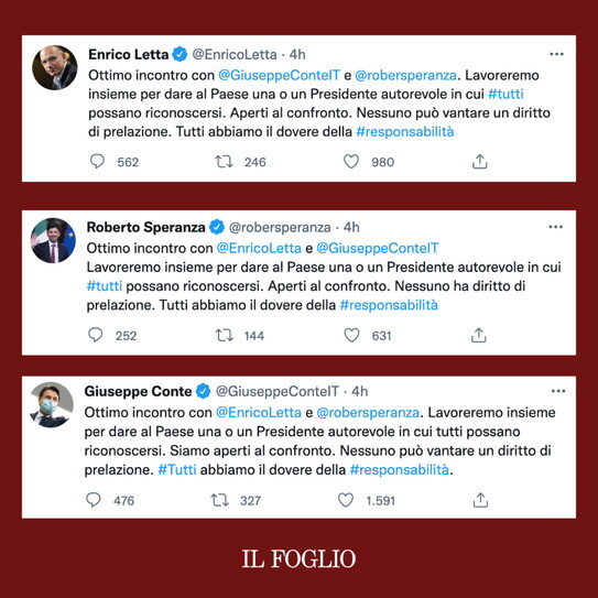 Conte di prima mattina ha ospitato a casa Enrico Letta e Roberto Speranza: una riunione di tre ore seguita dai tweet fotocopia dei tre leader (all'insegna dell'unità di facciata) e poi, poco più tardi, da una serie di fonti qualificate grilline che sbarravano al premier la strada verso il Quirinale.