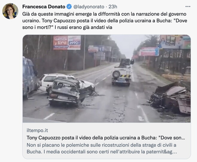 "Quest'aula non può diventare in alcun modo il megafono di posizioni assolutamente non accettabili. Il massacro di Bucha, onorevole Donato, è sotto gli occhi di tutti e noi non possiamo accettare, e lo dico con molta chiarezza, che in questa aula venga messo in discussione addirittura questo: i massacri che stanno avvenendo in queste ore di civili innocenti sono sotto gli occhi di tutti": la vicepresidente del Parlamento europeo Pina Picierno risponde così a Francesca Donato, l'europarlamentare che è uscita dalla Lega per le sue posizioni sul green pass ed è ora in prima fila nel sostenere le ragioni di Vladimir Putin e del Cremlino sull'invasione in Ucraina.