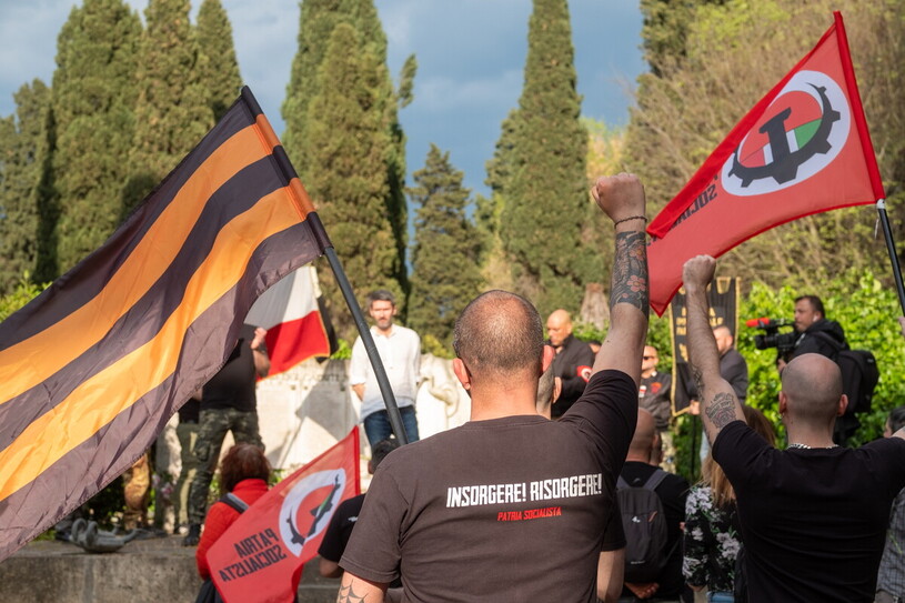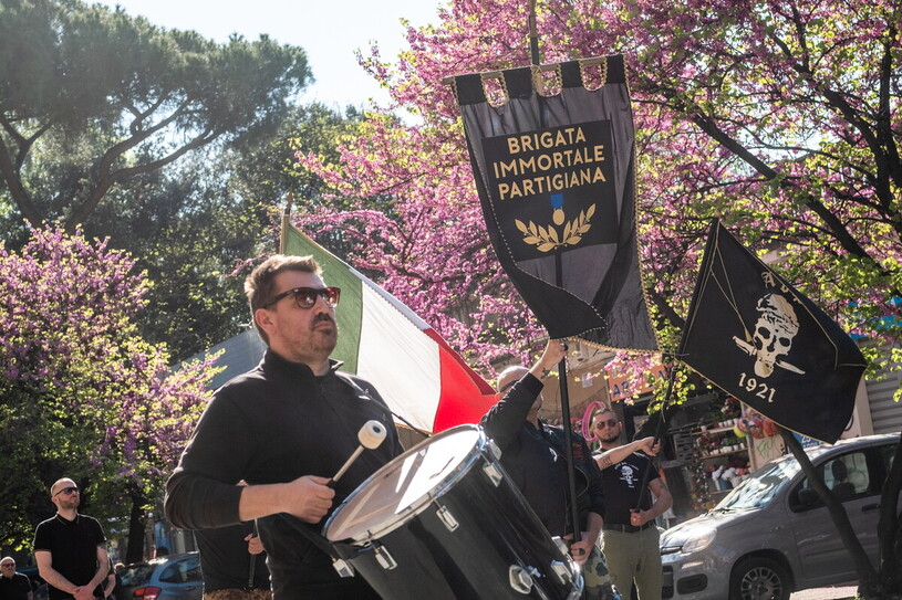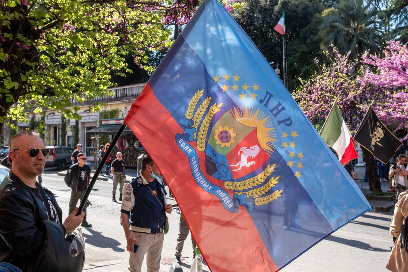 I militanti di Patria Socialista, l'estrema sinistra che giochicchia con l'identitarismo, hanno sfilato sabato in corteo nel quartiere di San Lorenzo verso il cimitero del Verano. Quest'anno la parata, in stile militare, con tamburi e divise, è dedicata alla memoria di Edy Ongaro detto "Bozambo", morto le scorse settimane combattendo nel battaglione pro-russo Prizrak, e "ai partigiani caduti in Donbas". Garofani rossi e drappi neri, falci e martelli e Fred Perry, pugni chiusi e teste rasate. E poi la bandiera insurrezionale del Luhansk e il nastro di San Giorgio (quello a righe nere e arancioni, che ricorda la più alta onorificenza zarista e che indossano le truppe russe che oggi invadono l'Ucraina). Già dall'iconografia, la marcia commemorativa in onore dei partigiani ospitata come ogni anno nella Capitale, spiega meglio di tante parole che cos'è il movimento rossobruno.