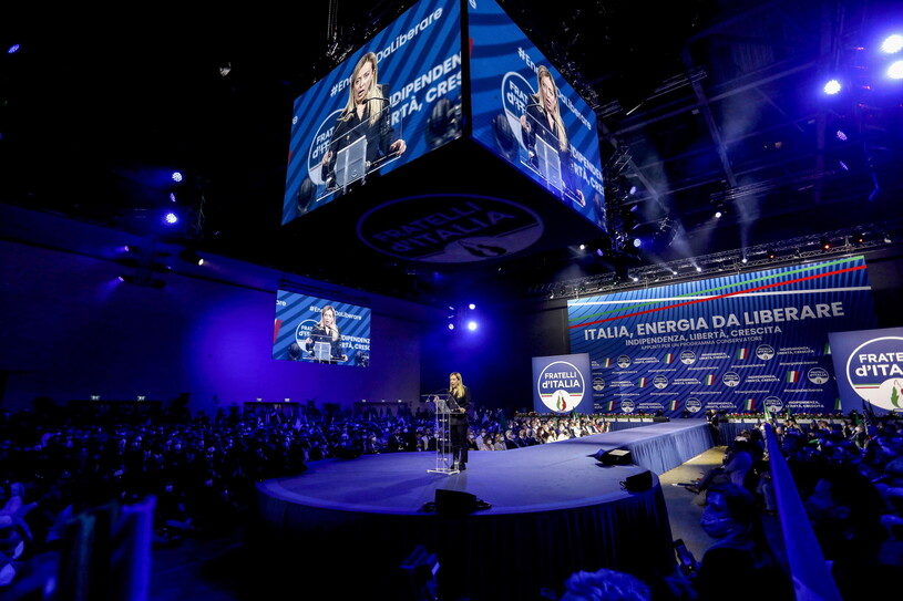 Il discorso non regala sorprese o cose inedite. E’ iper atlantista. Dice che va sostenuta l’Ucraina perché altrimenti arrivano i comunisti cinesi. Propone compensazioni per le imprese italiane colpite dall’effetto delle sanzioni. Rilancia il presidenzialismo. Annuncia che se arriverà a Palazzo Chigi “trasformerà questa epoca infame in un nuovo risorgimento italiano”. Sprona i ragazzi del sud a ribellarsi contro il Reddito di cittadinanza. Smonta la retorica grillina dell’uno vale uno. Standing ovation. Cita Prezzolini, che sta nel largo pantheon di FdI (come Longanesi, Flaiano, Giovanni Paolo II, Scruton, Sarfatti, Ferrari e pure Pasolini: tutti immortalati fuori dalla sala). Meloni avvisa che l’alta quota non deve dare alla testa. Non ci sono musiche celtiche ad accoglierla, ma Rino Gaetano e Francesco Guccini (“L’avvelenata”). Luci blu, fumo sparato per creare l’effetto convention Usa. Lo stato maggiore del partito è rapito. Sono tutti uomini. Giorgia e i suoi fratelli? Sì. Eccoli.
