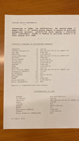 Il Ministro D'Incà ha avuto un confronto con il presidente Draghi il quale ha indicato come unica via percorribile la richiesta di fiducia al Senato sul Dl aiuti. La fiducia sarà posta al termine della discussione generale.