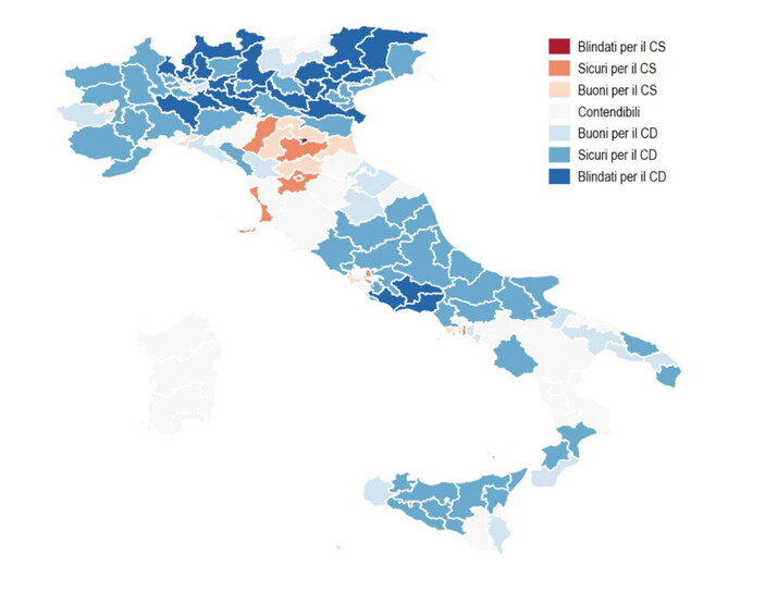 Effettivamente, la simulazione fatta dall’Istituto Cattaneo attribuisce al Partito democratico solo alcune circoscrizioni dell’Emilia-Romagna, della Toscana e quelle nelle parti centrali della grandi città come Milano, Roma e Napoli. Inoltre, secondo l’Istituto “la mancata alleanza tra Pd e M5s”, più volte annunciata da Letta dopo la fine del governo Draghi, “potrebbe consentire al centrodestra di prevalere in circa il 70 per cento dei collegi uninominali”. I principali danni dalla mancata unione però potrebbe subirli il Movimento 5 stelle, cui “non viene assegnata alcun chance di competere in nessun” collegio. Tuttavia, vi sono ampie zone in cui il risultato elettorale è ancora contendibile tra centrodestra e centrosinistra, sia alla Camera sia al Senato.