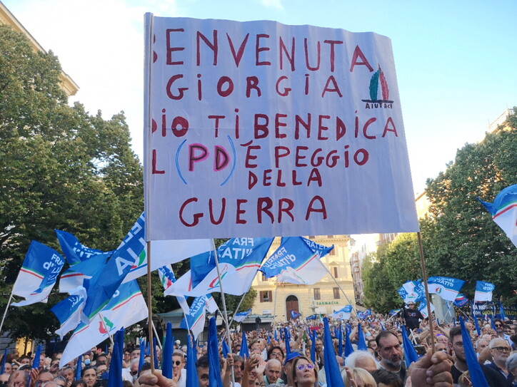 Sul video della donna stuprata a Piacenza confessa: “Mi aspetto un avviso di garanzia”. In disparte c’è Tommaso Longobardi, il Morisi di FdI, guru dei social e capo della bestiolina che Giorgia va subito a cercare finito il comizio. Tutti i giornali stranieri intanto attaccano la leader per questa storia del video. Il vero nervo scoperto di Meloni in queste ore. “Non mi sento di chiedere scusa, ho solo rilanciato il video pubblicato da un giornale nazionale”. La versione antisistema, chissà quanto vera, comprende anche gli attacchi alla “sinistra, ai giornali, ai salotti, ai talk”. Risposta del pubblico, scene già viste ai tempi del M5s e della Lega: “Giorgia, Giorgia”. Segue il balletto della leader. Spunta un cartello. “Benvenuta, Dio ti benedica: il Pd è peggio della guerra”. Segue anche la retorica della ragazza che viene da una famiglia poco abbiente, motivo per il quale è contro il Reddito di cittadinanza. “Ho fatto la cameriera”. Qui è pieno di parlamentari che sperano di diventare sottosegretari. Prossima tappa lunedì a Catania. Intanto le Marche metafora d’Italia. Diceva Ennio Flaiano: “C’è un sacco di gente che vive e lavora a Macerata”.